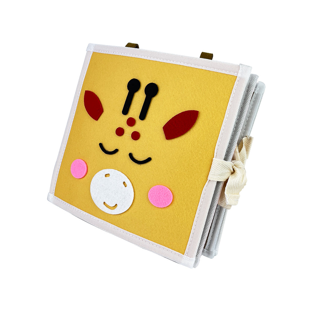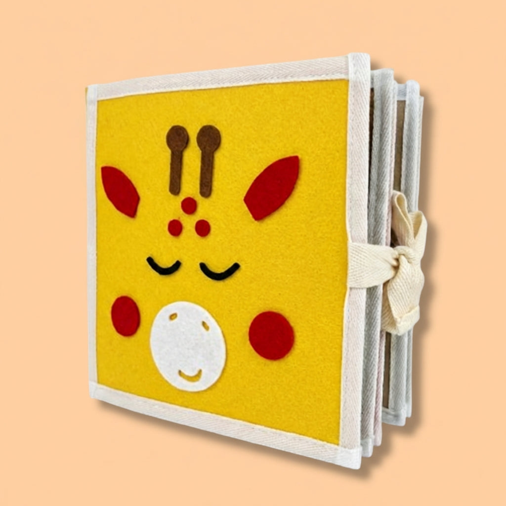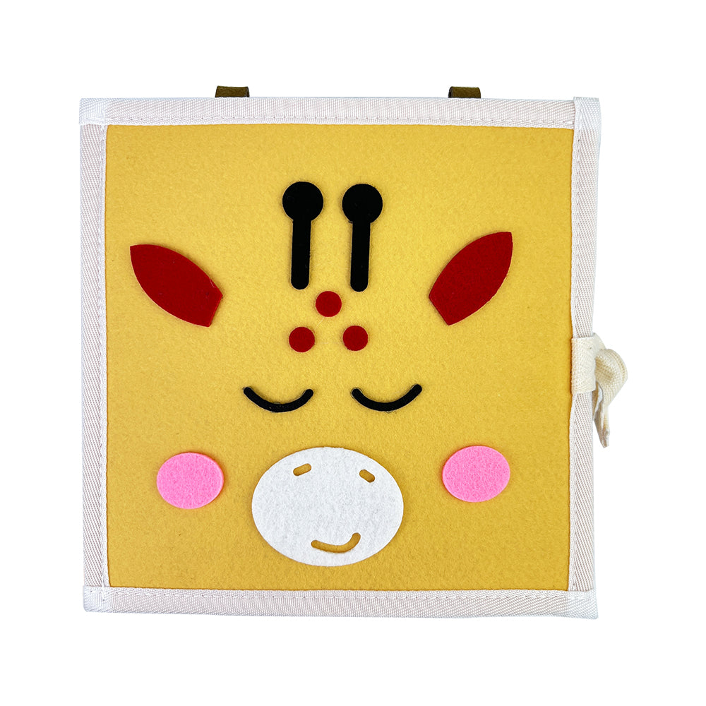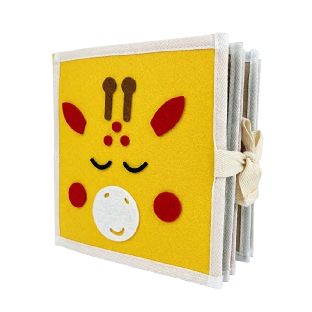 Met het Giraffe Speel & Leer Fluisterboekje ontdekken kinderen verschillende thema’s op een speelse en sensorische manier. Het boekje bevat 8 interactieve pagina’s met activiteiten zoals veters strikken, gezichtje puzzelen, kleuren vergelijken en andere motoriek-oefeningen.