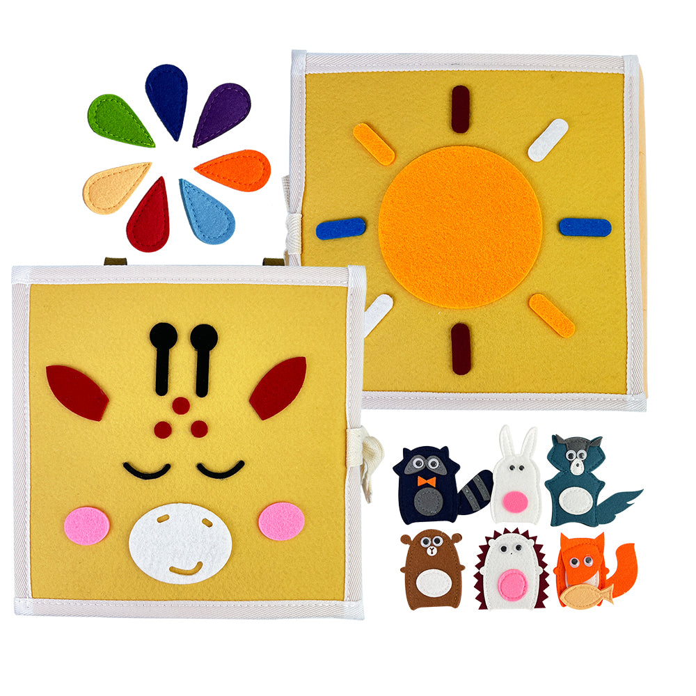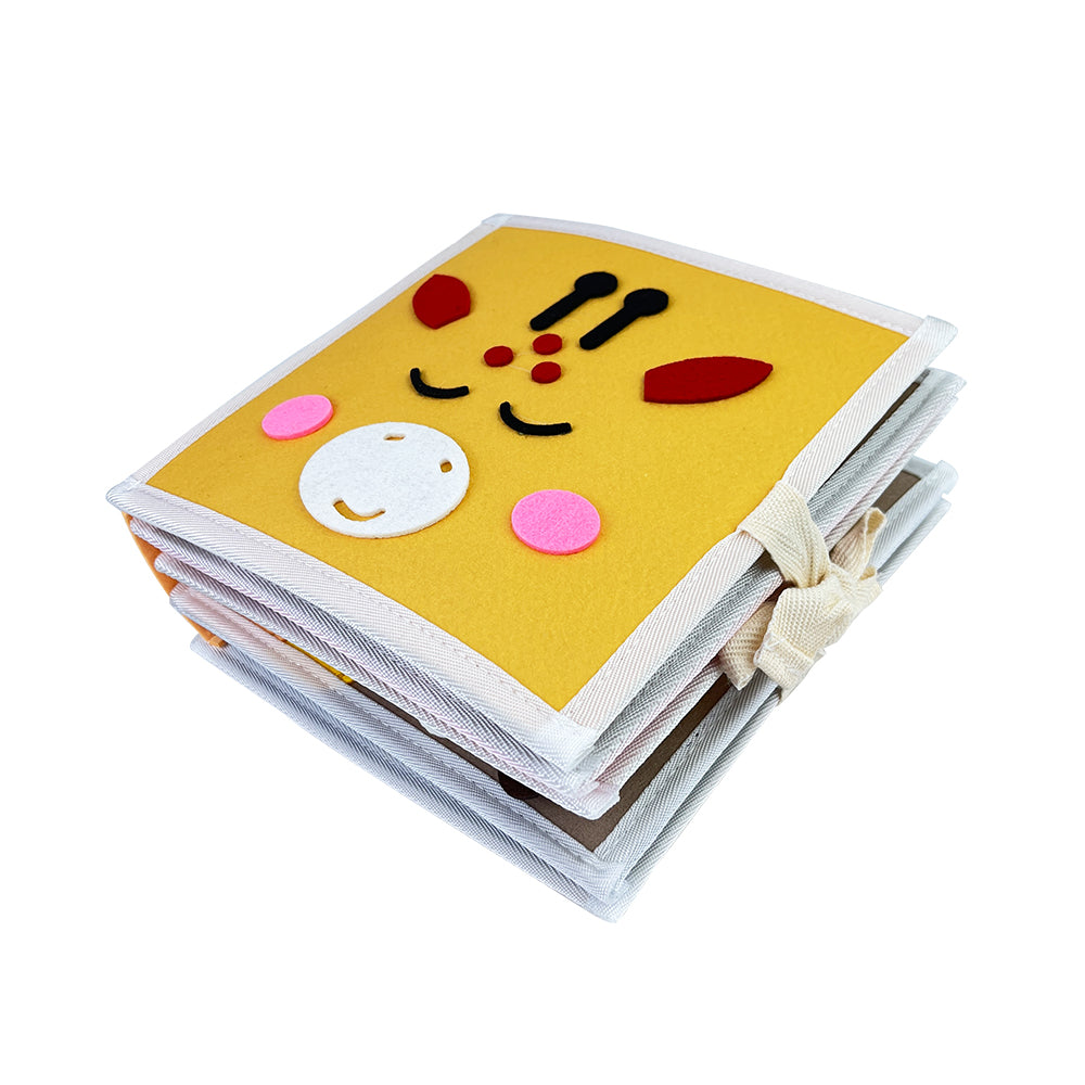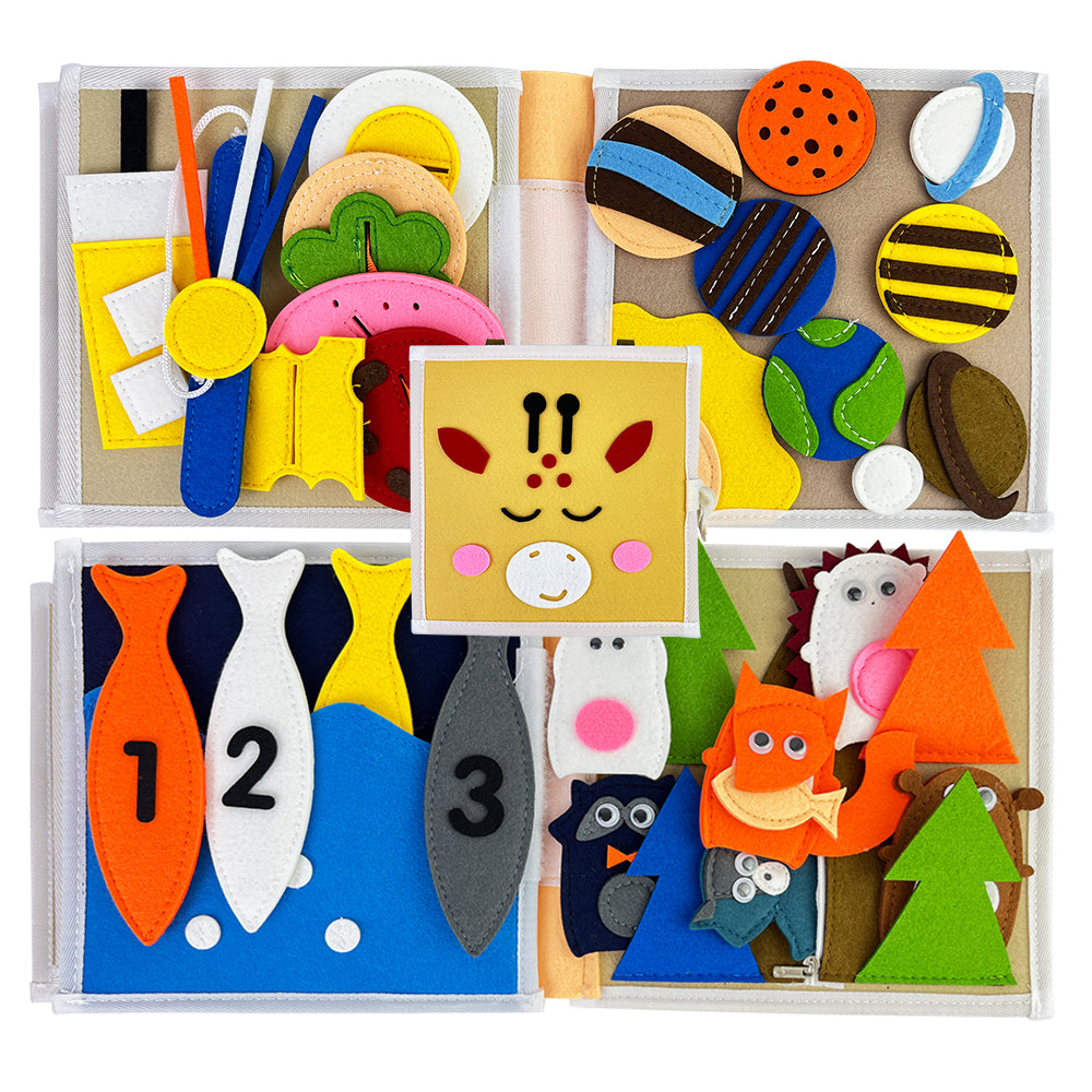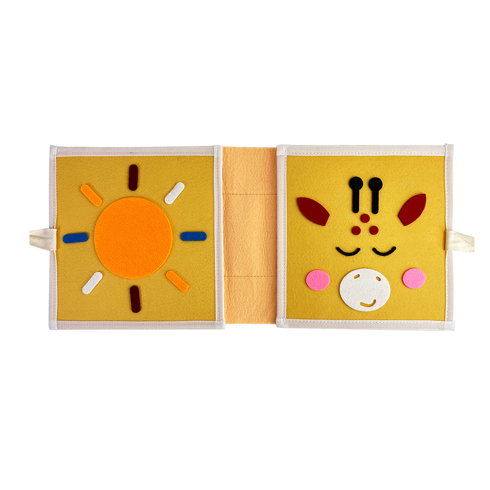 Met het Giraffe Speel & Leer Fluisterboekje ontdekken kinderen verschillende thema’s op een speelse en sensorische manier. Het boekje bevat 8 interactieve pagina’s met activiteiten zoals veters strikken, gezichtje puzzelen, kleuren vergelijken en andere motoriek-oefeningen.