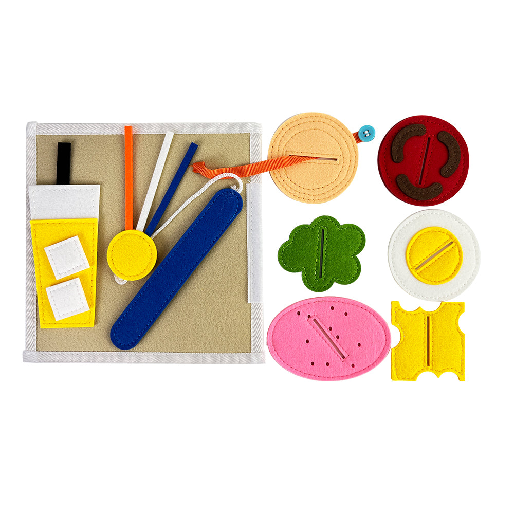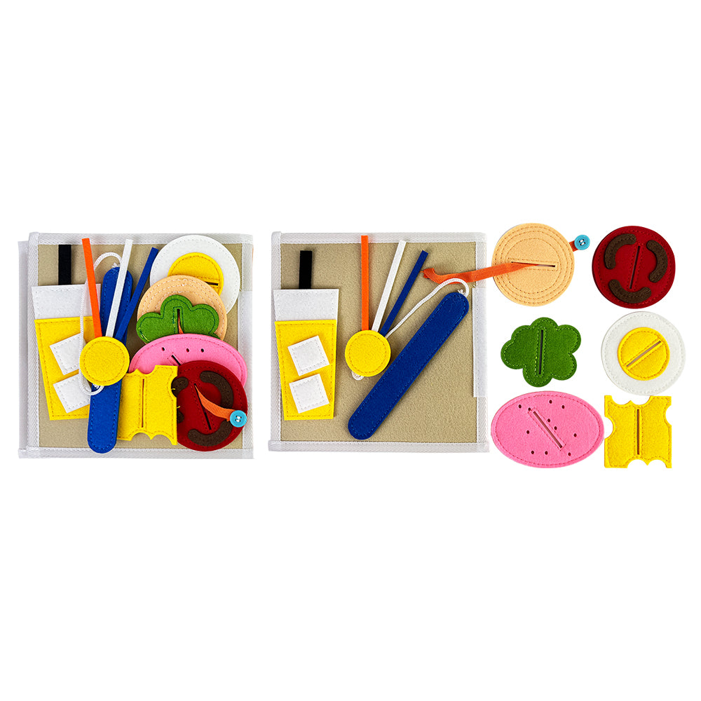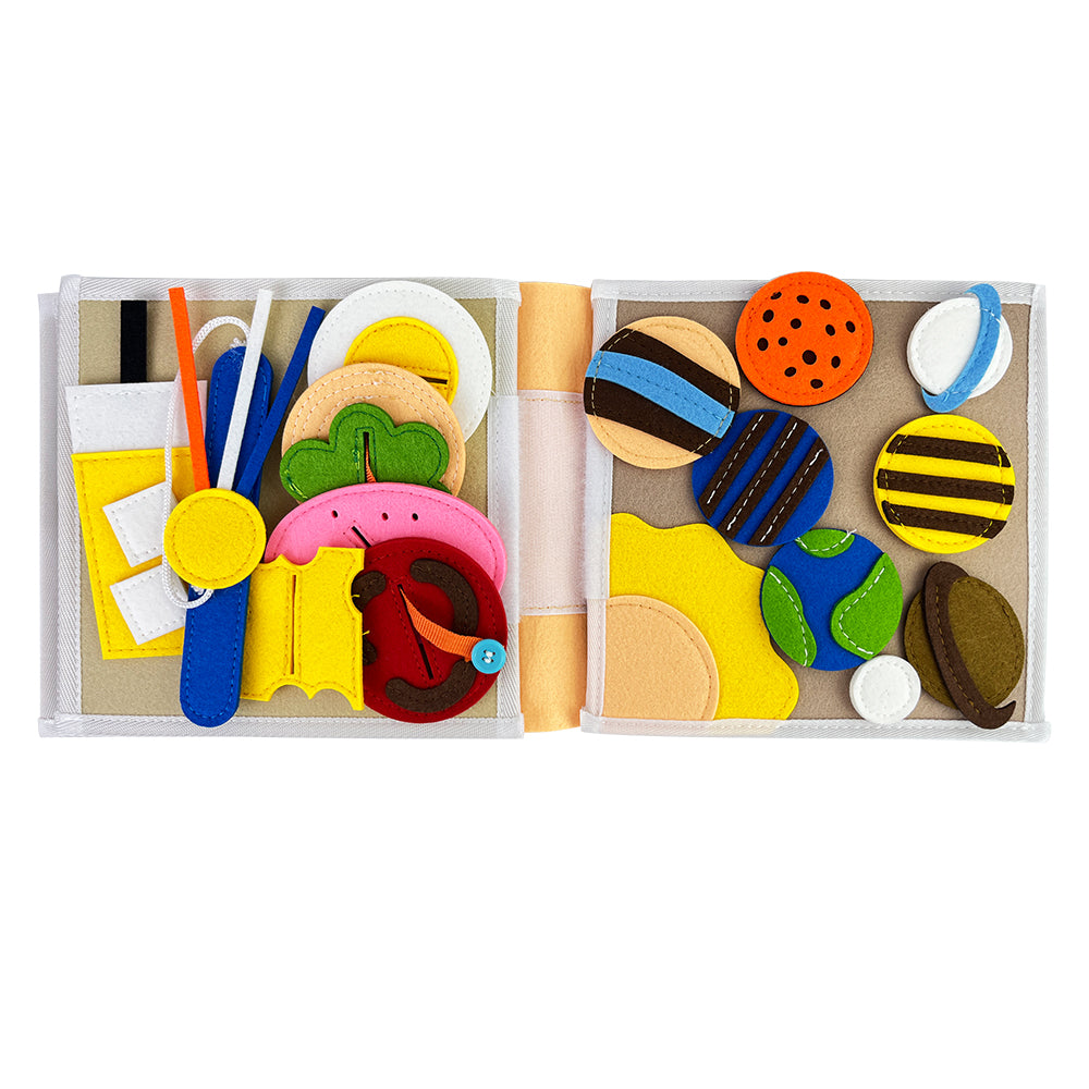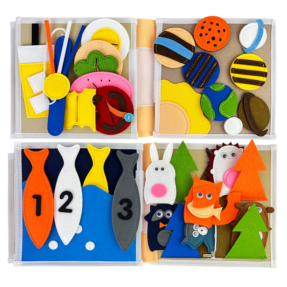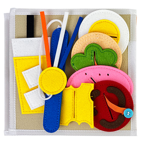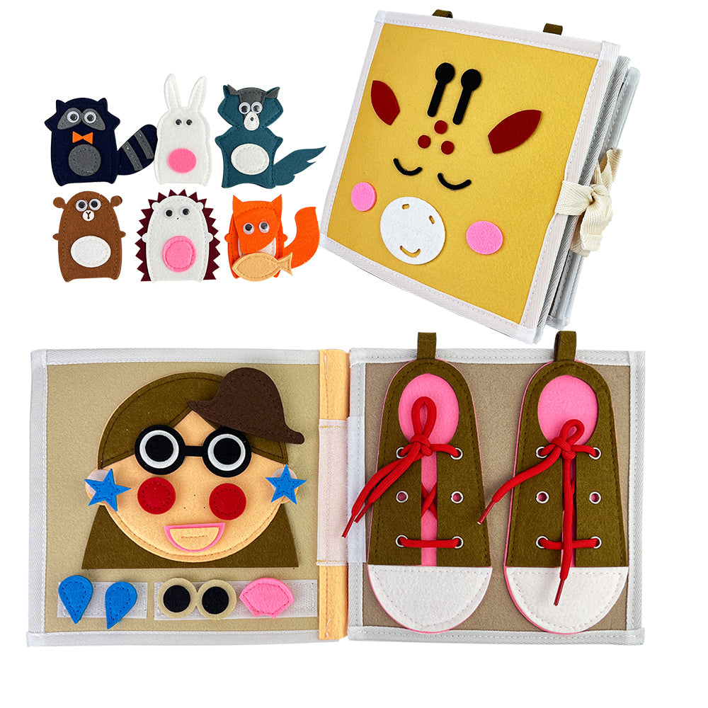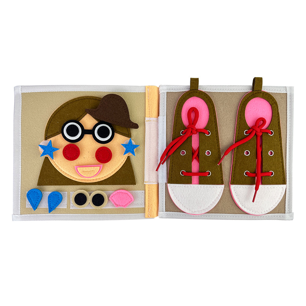 Dankzij de afneembare onderdelen en bewegende elementen kunnen kinderen zelfstandig leren en experimenteren, terwijl ze hun fijne motoriek en cognitieve vaardigheden ontwikkelen. Het veters strikken op de schoenenpagina helpt bij grijpgrepen en handcoördinatie, terwijl het gezichtje puzzelen inzicht geeft in vormen, positie en logica. Het kleuren vergelijken en ordenen stimuleert visuele waarneming en categoriseren.