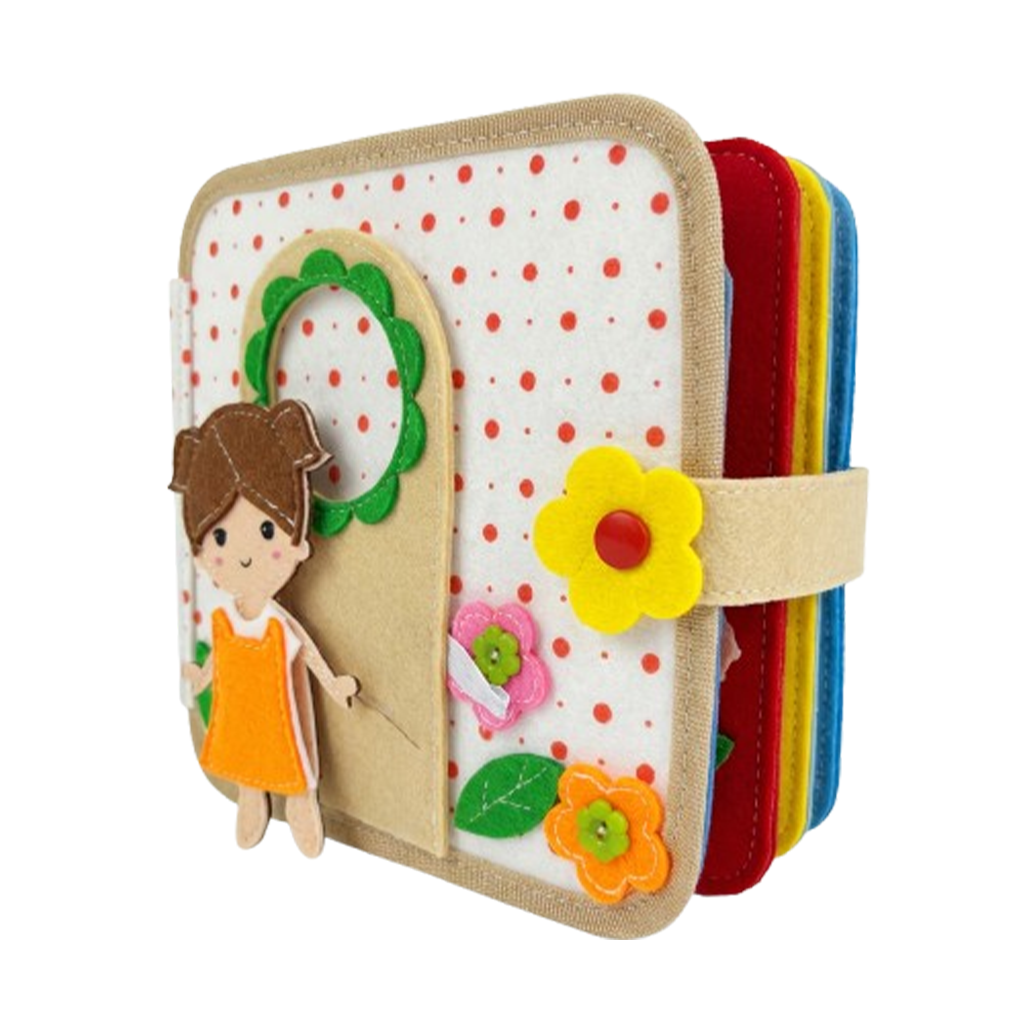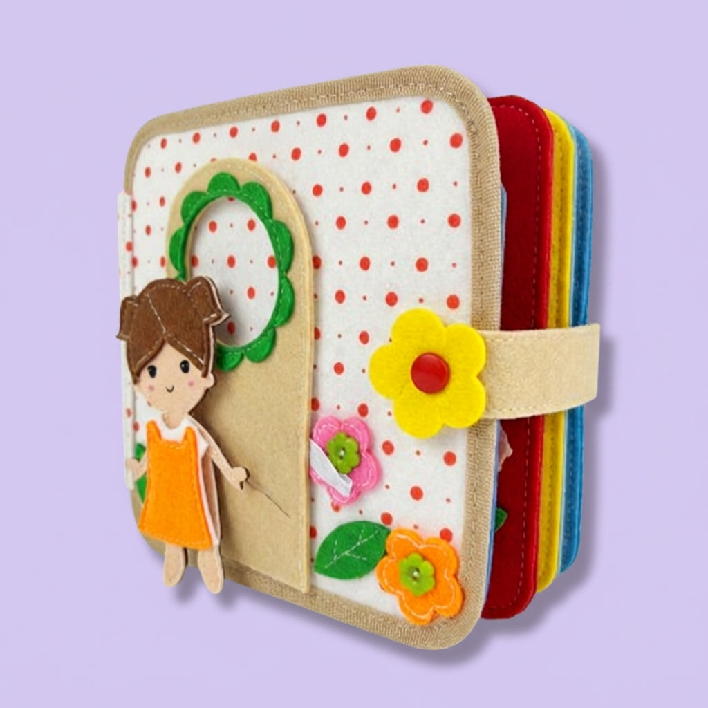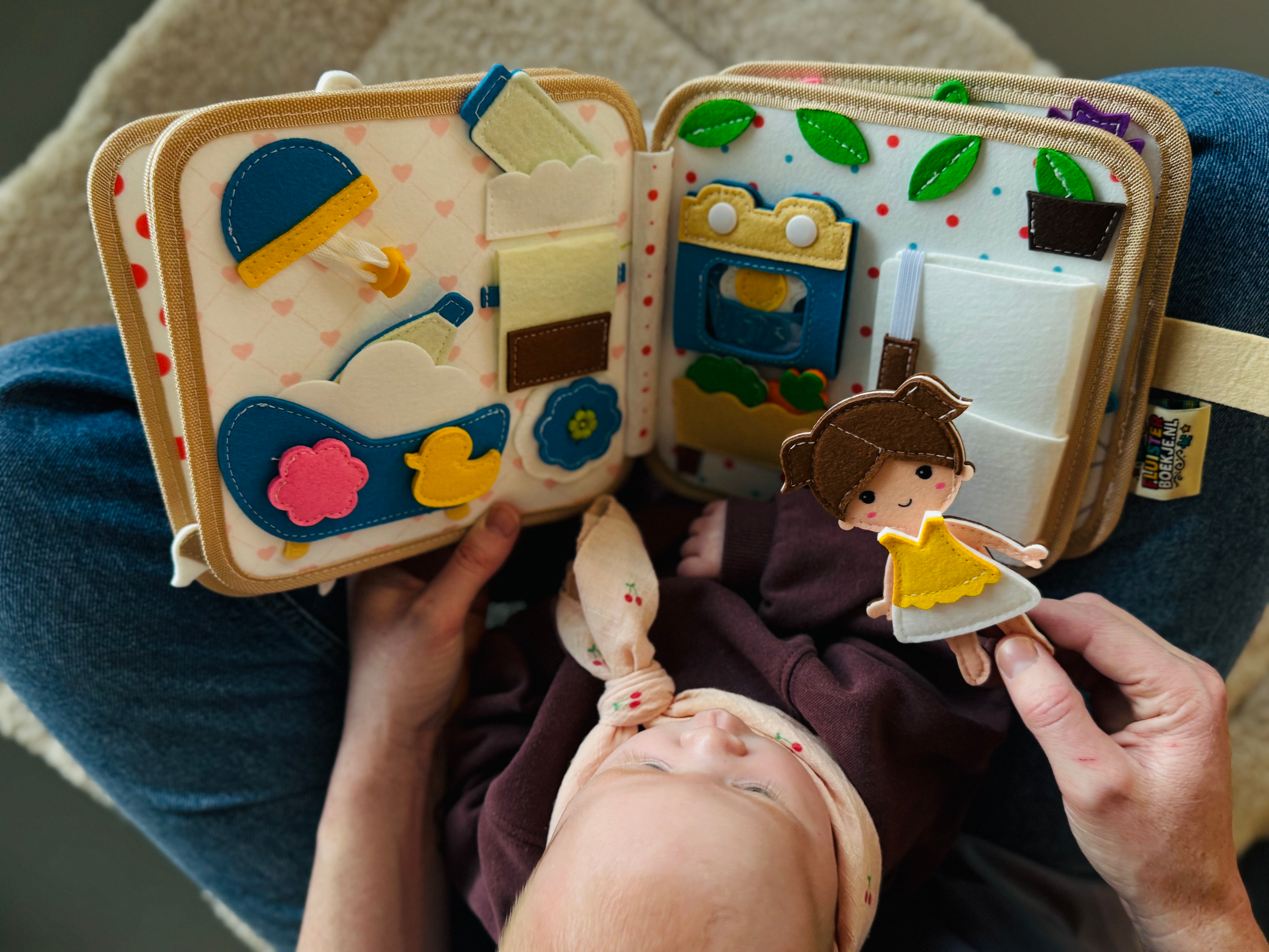 Fluisterboekjes zijn zachte, handgemaakte speelboekjes die kinderen uitdagen om te knopen, ritsen, sorteren, matchen en ontdekken.